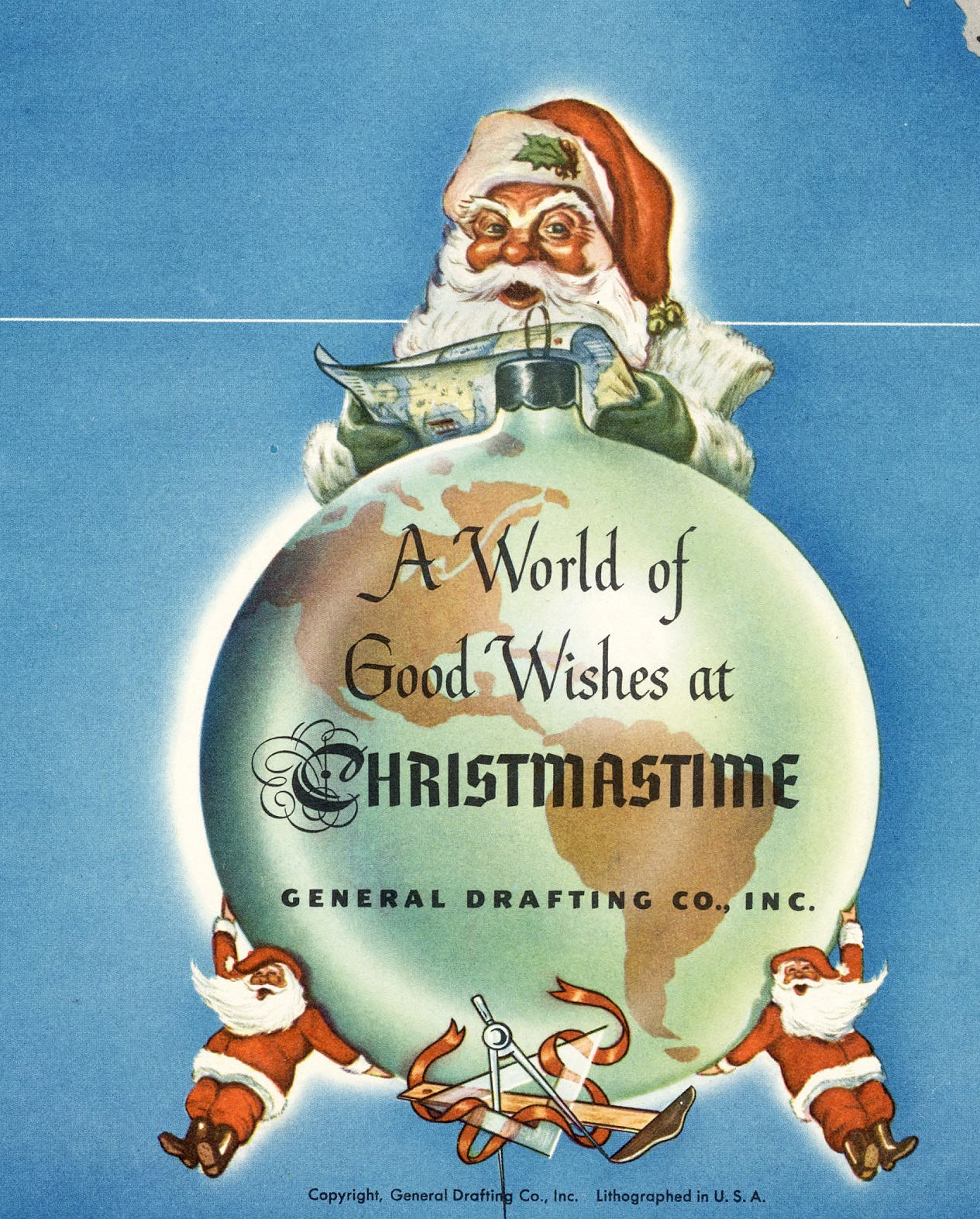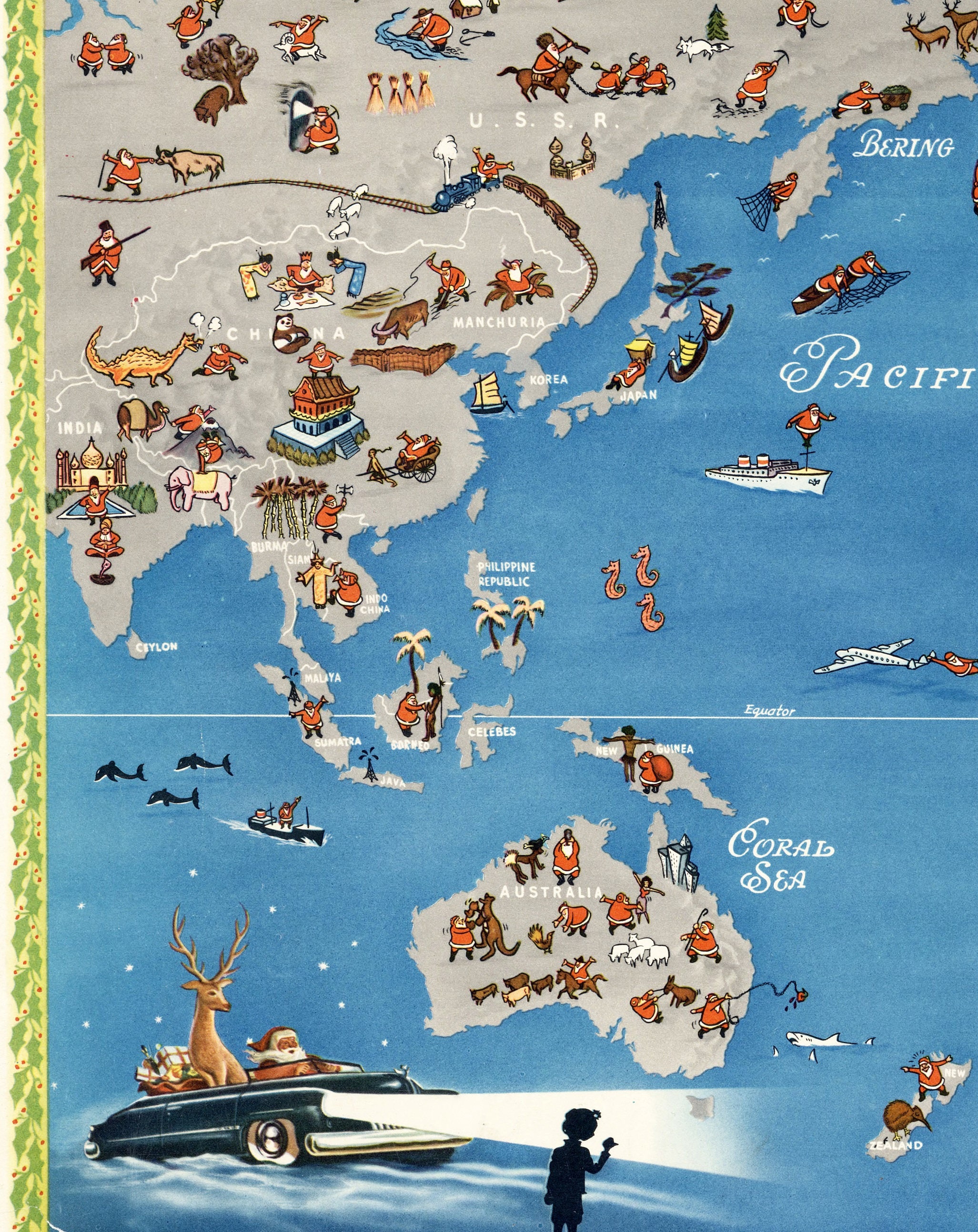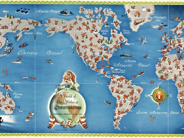 Great MERRY CHRISTMAS map with many Santa Claus on every continent!